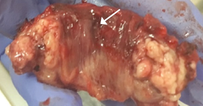 Рис. 3. Макропрепарат. Уретра рассечена вдоль, видны светлые опухолевые массы вокруг фрагмента уретры и очаг изъязвления слизистой оболочки (указан стрелкой)
