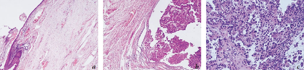 Fig. 4. Histological preparations of the urethra with a tumor: a – the mucous membrane of the urethra, there is no tumor growth (stain hematoxylin-eosin, ×40); b – clear cell carcinoma with invasive growth in the outer layers of the urethra (stain hematoxylin-eosin, ×100); c – clear cell carcinoma of the urethra (stain hematoxylin-eosin, ×200)