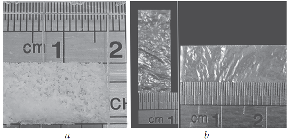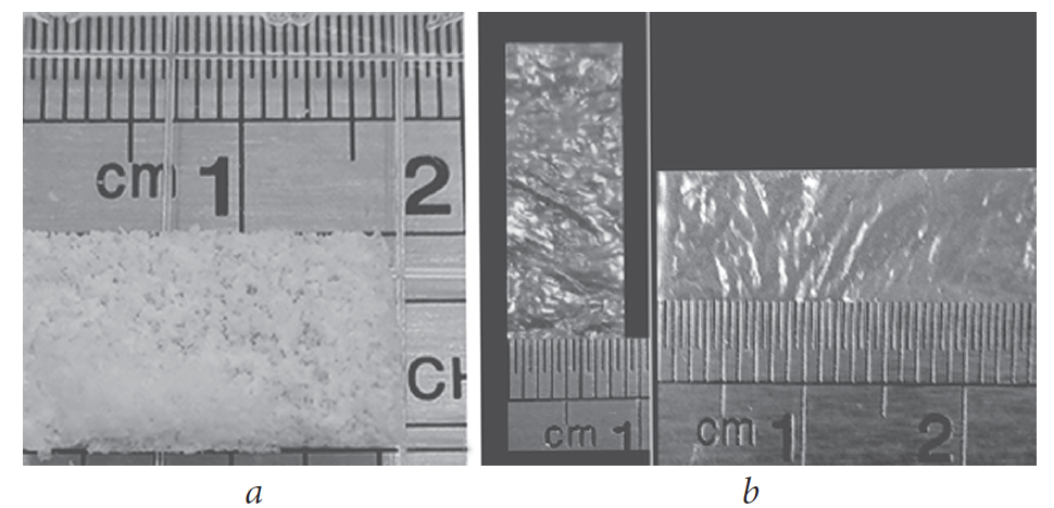 Рис. 1. Образцы приготовленных скаффолдов: а — пористый двуслойный из ПЛ + ПК; b — плоский двуслойный из ПЛГ + ПЛК