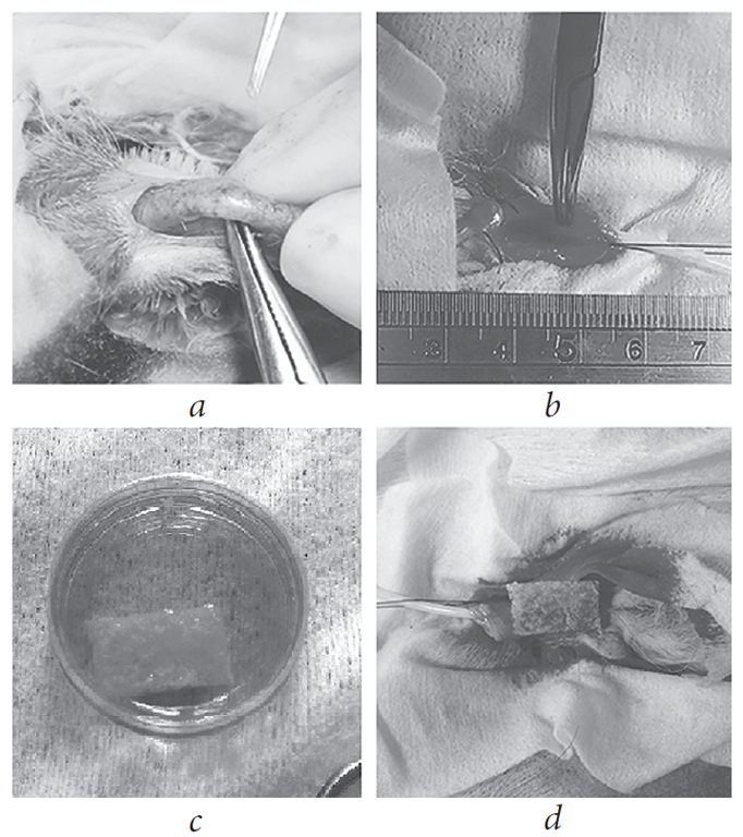 Рис. 3. Уретропластика с имплантацией тканеинженерной конструкции, состоящей из ПЛ + ПК с мезенхимальными стволовыми клетками: a — уретра выделена дорсо-латерально; b — вскрыт просвет уретры; c — тканеинженерная конструкция с мезенхимальными стволовыми клетками; d — сопоставление тканеинженерной конструкции и краев дефекта уретры