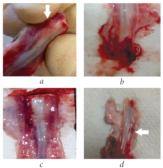 Рис. 7. Макропрепараты уретры кролика: a — визуализация зоны имплантации тканеинженерной конструкции (группа 1); b — зона имплантации не визуализирована (группа 2); c — визуализация буккального графта; d — уретро-кожный свищ (стрелка)