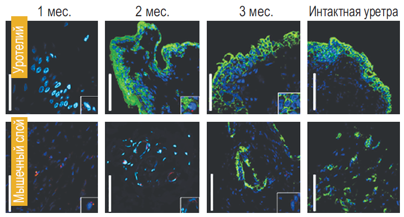 Результаты. При уретрографии получены схожие результаты у всех групп животных, независимо от типа имплантированного материала. Нарушений проходимости уретры выявлено не было, а при конфокальной микроскопии криосрезов уретры обнаружено присутствие в слизистом слое меченных наночастицами мезенхимальных стволовых клеток / клеток буккального эпителия с признаками их дифференцировки в уротелиальном направлении.