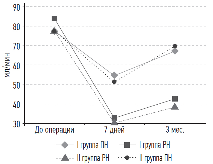 Рисунок. Динамика скорости клубочковой фильтрации до и после операций при опухолях почек. РН — радикальная нефрэктомия, РП — резекция почки / Figure. Dynamics of GFR before and after surgery for kidney tumors
