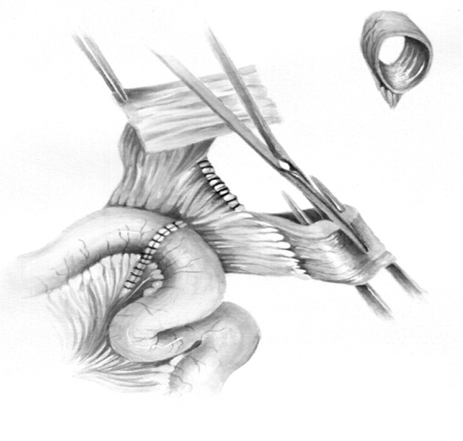 Рис. 3. Два коротких илеотрансплантата рассекаем по антибрыжеечным краям и поворачиваем на 90° навстречу друг другу. Справа вверху удаленный центральный сегмент трансплантата