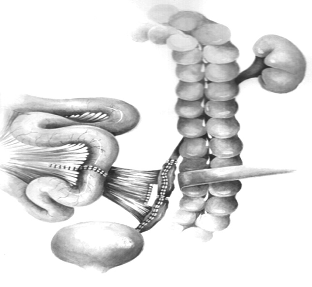 В случаях полного замещения мочеточника следует учитывать особенность анатомического строения тонкого кишечника, то есть несоответствие ширины брыжейки к длине извитой кишечной трубки. И чем больше мы берем сегмент кишки, тем больше это несоответствие. В связи с этим при взятии длинного илеотрансплантата для полного замещения мочеточника надо прежде всего ориентироваться на его брыжейку. Необходимо выкроить последнюю так, чтобы противоположные края ее без натяжения располагались рядом с лоханкой вверху и мочевого пузыря внизу. Однако в такой брыжеечный сегмент попадает соответствующий ему участок кишки, не прямой, а дугообразный и извилистый и потому имеющий большую длину, чем необходимо для тотальной илеоуретеропластики. Включение такого кишечного сегмента в мочевой тракт чревато застоем слизи и мочи, а также увеличивает площадь их возможной резорбции с развитием метаболических нарушений. Для укорочения и выпрямления кишечного трансплантата мы резецировали 10–15 см его длины в центральной части с межкишечным анастомозом «конец-в-конец», оставляя брыжейку интактной. Недостатком данного метода является взятие кишечного трансплантата большей длины, резекция его в центральной части и дополнительный межкишечный анастомоз, что увеличивает травматичность и удлиняет время операции. В связи с этим мы разработали более простую технику выпрямления кишечной трубки (патент на изобретение № 2744022 от 02.03.2021). Она заключается в нанесении продольных насечек на брыжейку в ее межсосудистых зонах длиной 1–1,5 см в количестве 7–10. В результате высота брыжейки уменьшается, а ширина увеличивается, приближаясь к длине кишечной трубки.