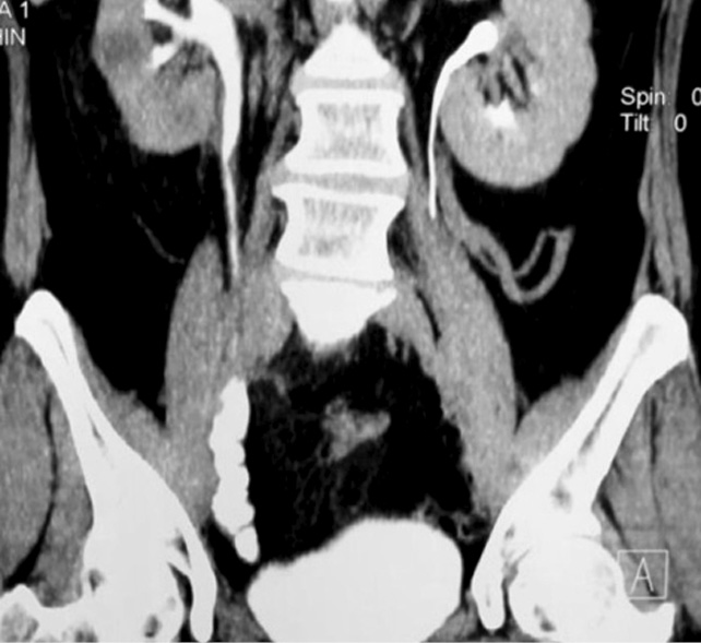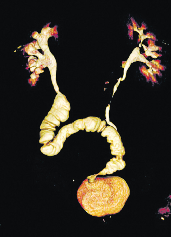 Рис. 11. Мультиспиральная компьютерная томография с контрастированием пациентки через 5 лет после двусторонней изоперистальтической 7-образной илеоуретеропластики