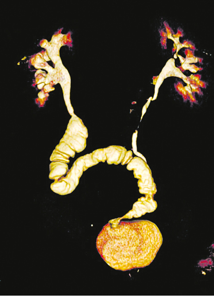 Рис. 7. Мультиспиральная компьютерная томография с контрастированием пациентки через 2 года после правосторонней илеоуретеропластики двумя кишечными трансплантатами по Yang – Monti в нашей модификации