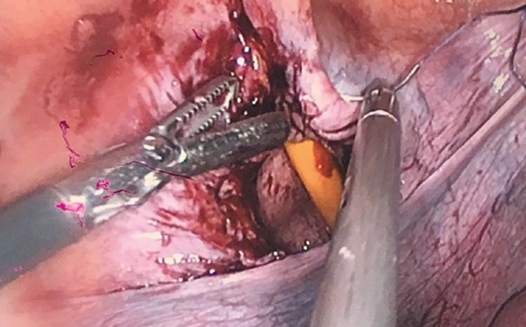 Всем пациентам после санации брюшной полости проводили осмотр мочевого пузыря. Разрывы во всех случаях локализовались на внутрибрюшинной части мочевого пузыря. Полость мочевого пузыря в ходе лапароскопии также осматривали для исключения комбинированных повреждений (рис. 4). Размеры разрыва составляли от 2 до 8 см. Последовательность ушивания разрыва мочевого пузыря и установки надлобковой цистостомы во всех трех случаях были разными.
