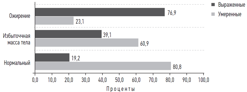 Fig. 1. Frequency of severe and moderate manifestations of chronic abacterial prostatitis with an inflammatory component depending on body mass index