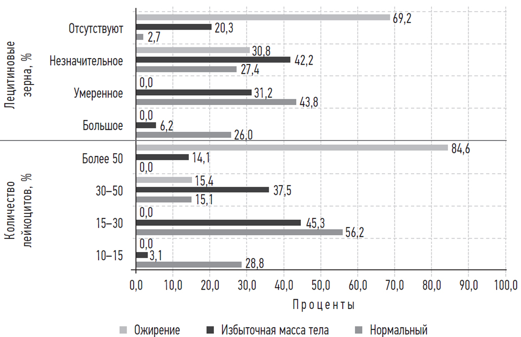 Результаты лабораторных исследований показали, что более высокие значения ИМТ у больных ХНПВК были ассоциированы с большим числом лейкоцитов и уменьшением количества лецитиновых зерен. Так, мужчины с ожирением имели наибольшее количество лейкоцитов и наименьшее — лецитиновых зерен, у пациентов с избыточной массой тела наблюдались промежуточные значения относительно пациентов с ожирением и с нормальными показателями ИМТ (рис. 2).