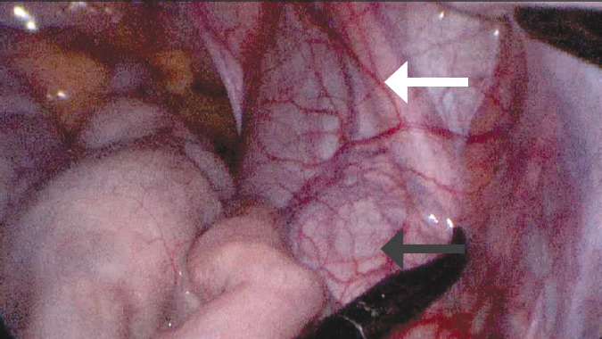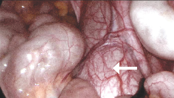 Fig. 2. Intraoperative view of a retroperitoneal formation protruding into the abdominal cavity (indicated by an arrow)