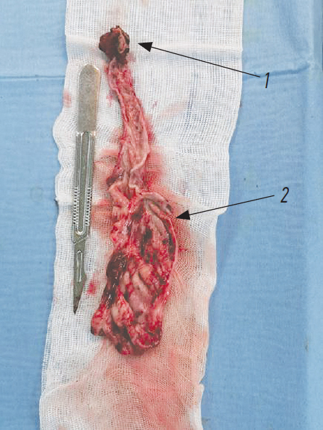 Fig. 6. The final view of the extracted specimen. 1 — sharply hypoplastic lower segment of the double right kidney; 2 — atretic ureter (mucosa)