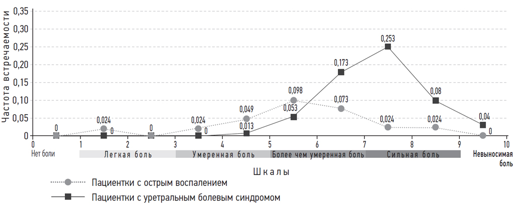 The patient considers herself ill for 11 years. She was treated by gynecologists (bacterial vaginitis) and urologists. According to the patient no abnormalities were found in urine tests; however, treatment was conducted due to cystitis. She received long-term antibacterial treatment. A year ago, cystoscopy revealed a presentation of the epithelium metaplasia in the bladder neck. That time she began to feel a constant dull pain in the urethra. Any physical activity is accompanied by lower back pain and increased burning sensation in the urethra. Anamnesis revealed that she grew and developed within strict limits of her parents. The girl was required to show high academic performance at school; however, she did not succeed in it. She was afraid of her parents. She notes broken sleep during childhood and adolescence. At school, there were frequent conflicts with peers; as a result, she experienced stress and often cried. Her sexual life started at 17 years old. She got married at the age of 20. With the onset of regular sexual activity, the above complaints appeared. For 10 years, she has been receiving the antidepressant Reksetin on a regular basis and is monitored by a psychotherapist; she titrates the dose of the drug if panic attacks occur. She notes pronounced discomfort during sexual activity and tries to limit the amount of sexual intercourse. She has two children. She had childbirth at the age of 24 years old. In 2018, she underwent cesarean section. Ultrasound between pregnancies revealed endometriosis; therefore, she received hormonal treatment. After giving birth, she gained 30 kg and believed that it was a side effect of Reksetin. She frequently, almost monthly over the past year, has labial herpes.