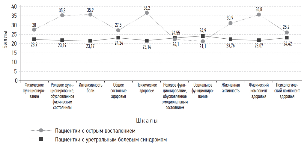 It is noteworthy that the profile of a patient with acute inflammation is characterized by significant variability in the values of the signs under study. The difference is especially noticeable in indicators such as “physical role,” “pain,” “mental health,” “vitality,” and “physical component of health,” which were higher in a patient with acute inflammation than in a UPS patient. It can be concluded that in general, the quality of life in patients with acute inflammation was subjectively higher (Fig. 2).