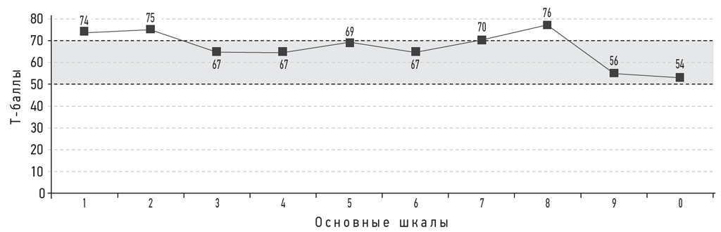 - Scale of overcontrol (74): The data obtained on the current scale indicate a tendency to social passivity, obedience, and poor self-control in interpersonal conflicts. Excessive emotional tension results in difficult adaptation, which is manifested by increased concentration on deviations from the norm both in terms of interpersonal relations, where such people can be irritated by irresponsibility and insufficient morality of the actions of others, in their opinion, and in the sphere of well-being, where excessive attention to the functions of their own body can develop into hypochondriasis.