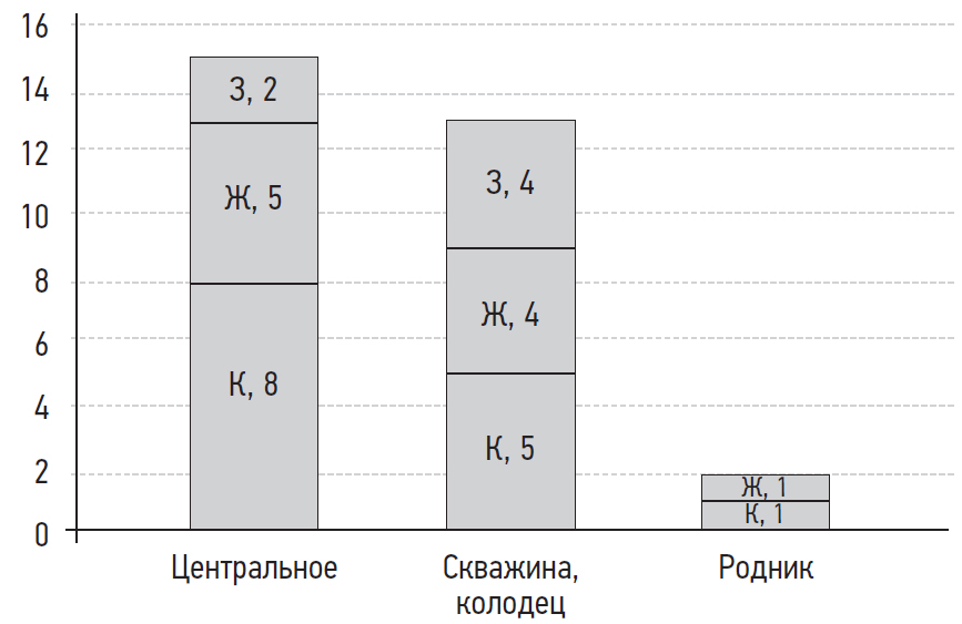Примечание. Типы водозаборов: 0 — центральный; 1 — скважина, колодец; 3 — родник. Жирным шрифтом выделены статистически значимые различия. *Нет данных. Note. Water intake types: 0 — central; 1 — borehole, well; 3 — spring. Statistically significant differences are highlighted in semi-bold. *No data. | |||