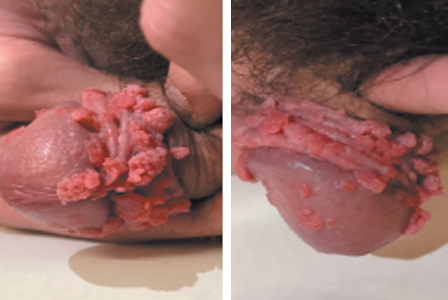 A 29-year-old male patient was examined at the urology clinic for multiple recurrent condyloma acuminata of the penis. According to the patient, 4 months ago, he noticed a small (up to 3 mm) irregularly shaped lesion on the glans penis, raised above the skin. Over the next 2 months, several similar growths appeared on both the glans and the inner preputial surface. The patient was subsequently referred to a dermatologist at a military hospital. Following the recommendation, he received conservative oral therapy with inosine pranobex at a dose of 500 mg three times a day for 20-day courses in combination with multivitamins. Local treatment with podophyllotoxin (0.15% cream) twice daily onto the condylomas for 3 days with a 4-day interval. This treatment was repeated twice until there was a reduction in clinical symptoms, resulting in the disappearance of most warts. However, in the beginning of Month 4, the pathological process progressed with the appearance of multiple recurrent genital warts on the glans and inner preputial surface of the penis.