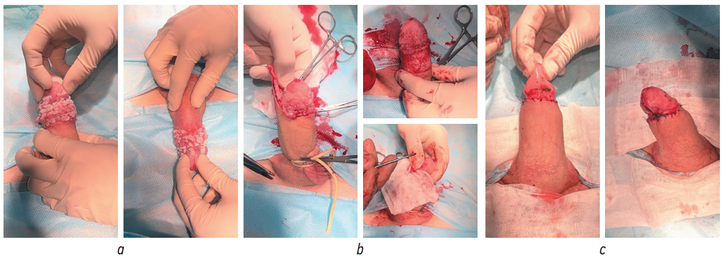 Fig. 2. Stages of surgical intervention: a, penis with an exposed glans before surgery; b, circular excision of the foreskin; c, final outcome of surgical treatment