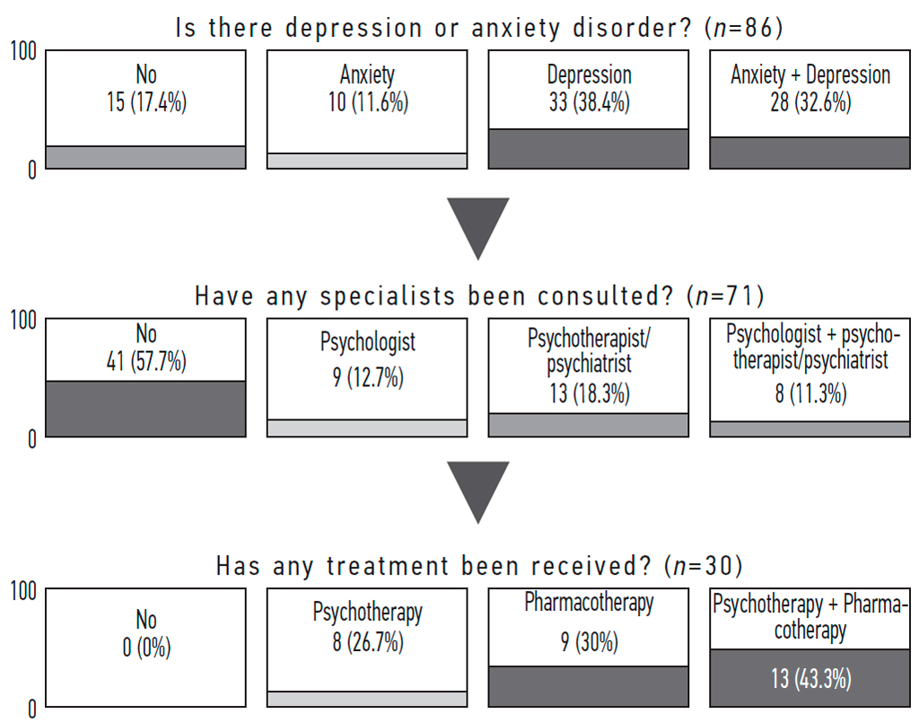 The presence of symptoms of depression or anxiety disorder in women with PC was assessed using a survey (Fig. 1). The described psychiatric conditions were reported by 71/86 (82.6%) patients, with anxiety disorder in 10/86 (11.6%) patients, depression in 33/86 (38.4%) patients, and the presence of both conditions in 28/86 (32.6%) patients. Of these patients, only 42.3% sought consultation with a specialist. The results of treatment indicated the implementation of specialized therapy in all cases, with 43.3% of women receiving combination therapy comprising psychotherapy and antidepressants or antianxiety medications.