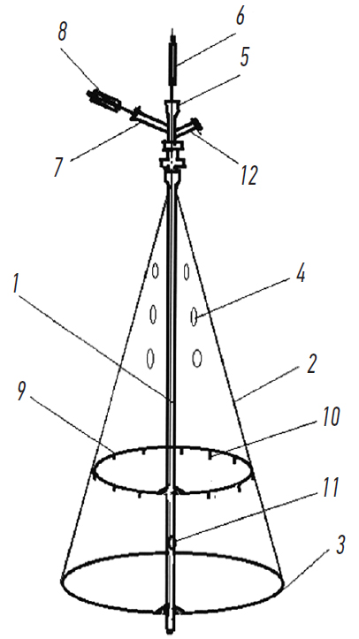 Рис. 1. Тромбоэкстрактор. 1 полиуретановый катетер; 2 — конусообразная синтетическая ловушка-мешок; 3 наружная режущая нитиноловая петля; 4 отверстия для сохранения кровотока в процессе захвата; 5 патрубок для ввода; 6 рукоятка управления; 7 порт; 8 рукоятка управления дополнительной внутренней петлей; 9 дополнительная внутренняя нитиноловая петля; 10 крючки для фиксации опухолевого тромба; 11 дополнительное отверстие для поступления контрастного вещества; 12 порт для введения контрастного вещества