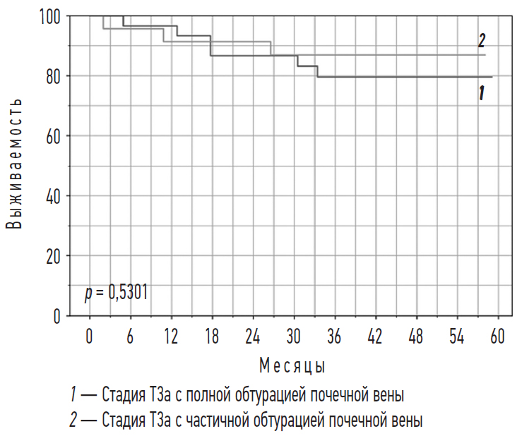 Трехлетняя безрецидивная выживаемость пациентов со стадией заболевания T3a в группах с частичной и полной обтурацией почечной вены опухолевыми массами значительно различается (86,6 и 79,6 % соответственно; лог-ранговый тест: χ2 = 0,43; р = 0,57). В группе с частичной обтурацией почечной вены среднее время до наступления рецидива составило 52,4 ± 3,2 мес., а у пациентов с полной обструкцией почечной вены — 50,8 ± 3,0 мес. Эти данные представлены на рис. 2.