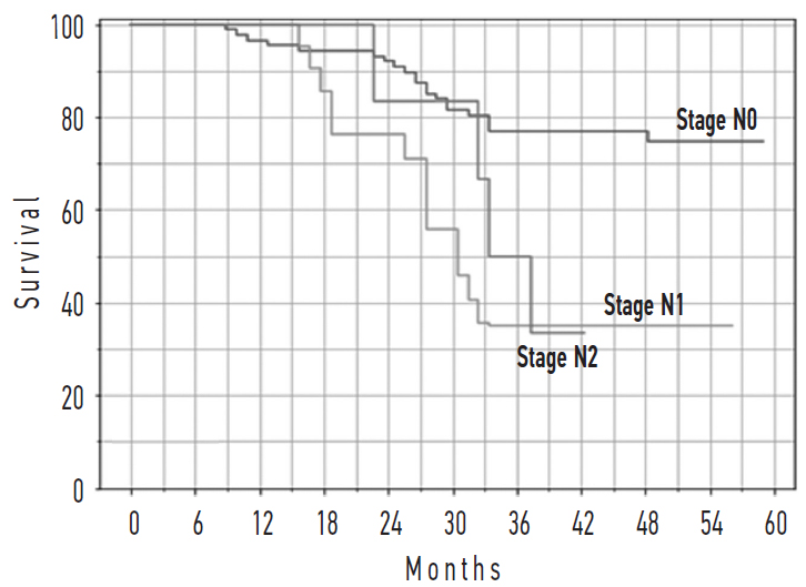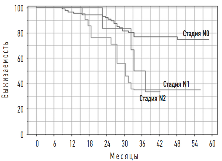 Поражение лимфоузлов отрицательно повлияло на долгосрочную выживаемость пациентов. Трехлетняя выживаемость при стадии N0 (76,4 %) оказалась достоверно выше, чем у больных с N1 (р = 0,0003). Данные представлены на рис. 3.