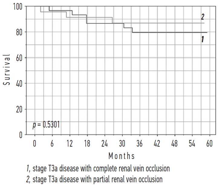 3. Рис. 2. Трехлетняя безрецидивная выживаемость в группах пациентов с разной степенью обтурации почечной вены в стадии рТ3а
