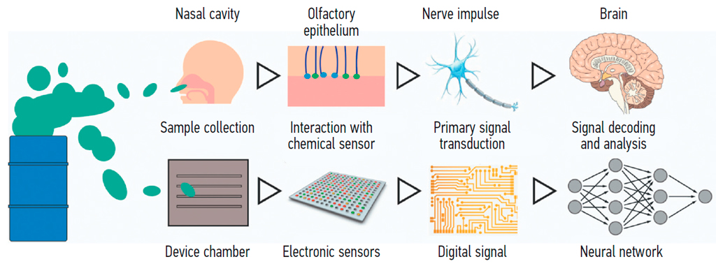 Fig. 1. Algorithm for odor recognition using an electronic nose (comparative diagram of biological and electronic noses). Photo: Marianna Yerknapeshyan / Scientific Russia. Information sourced from the portal “Scientific Russia” (https://scientificrussia.ru/).