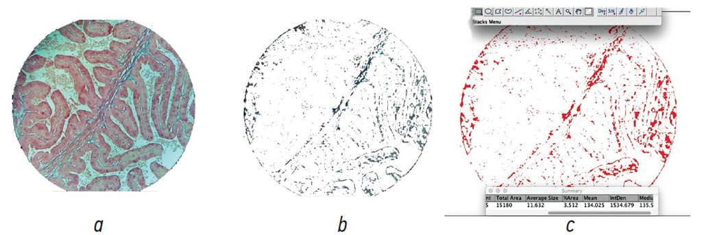 Рис. 1. Микропрепарат предстательной железы животного 1-й группы: a — микрофотография нормальной предстательной железы, фестончатый контур, тонкие междольковые перегородки, большое количество секрета; b — изображение изолированной соединительной ткани, обработано в программе ImageJ; с — подсчет площади соединительной ткани в интерфейсе программы ImageJ