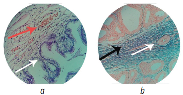 Рис. 2. Микропрепарат предстательной железы животного 2-й группы через 1 месяц после начала эксперимента: а — сглаженный контур желез, сниженная секреторная активность (белая стрелка), расширенные интрапростатические вены (красная стрелка), окраска гематоксилином и эозином, ×100; b — выраженный междольковый фиброз (черная стрелка), перифокальный фиброз и утолщенная стенка венулы (белая стрелка), окраска по Маллори, ×100