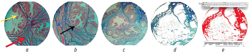 Рис. 3. Микропрепарат предстательной железы животного 2-й группы через 3 месяца после начала эксперимента: a, b — десквамированный эпителий в просвете ацинусов (желтая стрелка), выраженный междольковый и перифокальный фиброз (красная стрелка), расширенные венулы (синяя стрелка), резкое снижение высоты эпителия (черная стрелка). Окраска по Маллори, ×100; с — микрофотография измененной предстательной железы, сглаженный контур, толстые междольковые перегородки, отсутствие секрета; d — изображение изолированной соединительной ткани, обработано в программе ImageJ; е — подсчет площади соединительной ткани в интерфейсе программы ImageJ