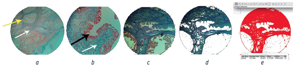 Рис. 4. Микропрепарат предстательной железы животного 2-й группы через 6 месцев после начала эксперимента: a — утолщенные фиброзные прослойки сдавливают железистые структуры (белая стрелка), отдельные группы ацинусов со сниженной высотой эпителия (желтая стрелка). Окраска по Маллори, ×40; b — фибротические изменения ацинусов предстательной железы (белая стрелка), резко сглаженный контур эпителия с отсутствием секрета в просвете ацинусов (черная стрелка). Окраска по Маллори, ×100; с — микрофотография измененной предстательной железы с выраженным интраацинарным фиброзом; d — изображение изолированной соединительной ткани, обработано в программе ImageJ; е — подсчет площади соединительной ткани в интерфейсе программы ImageJ