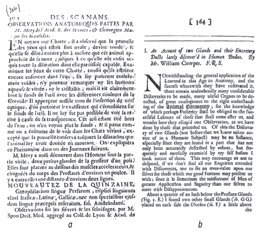 Fig. 1. Page of editions describing the bulbourethral glands: a – the first description of Jean Mery from the French edition of the Journal des scavans (1684); b – title page of W. Cowper’s work “An Account of Two Glands and Their Excretory Ducts Lately Discover’d in Human Bodies” (1699) / Рис. 1. Страницы изданий с описанием бульбоуретральных желез: а — первое описание Jean Mery из французского издания «Journal des scavans» (1684); b — титульный лист труда W. Cowper «An Account of Two Glands and Their Excretory Ducts Lately Discover’d in Human Bodies» (1699)