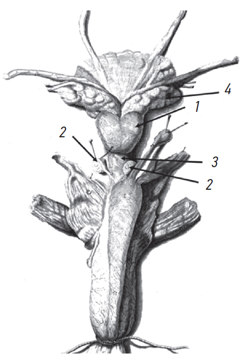 Fig. 2. Organocomplex of the small pelvis of a man according (to: W. Cowper, 1699). 1 – prostate gland, 2 – bulbourethral glands, 3 – urethra, 4 – seminal vesicles / Рис. 2. Органокомплекс малого таза мужчины (по: W. Cowper, 1699). 1 — предстательная железа, 2 — бульбоуретральные железы, 3 — уретра, 4 — семенные пузырьки