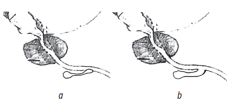 Fig. 3. Types of Cowper’s syringocele according to R. Bevers [5]: a – closed; b – open / Рис. 3. Типы сирингоцеле Купера по R. Bevers [5]: а — закрытое; b — открытое