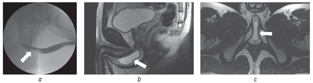 Fig. 6. Patient Sh., 19 years old: a – ascending urethrogram of the filling defect corresponding to the location of the bulbourethral cyst is determined (indicated by the arrow); b, c – magnetic resonance imaging of the small pelvis, in two projections a cystic formation is determined – a syringocele with thin septa (indicated by arrows) / Рис. 6. Пациент Ш., 19 лет: а — восходящая уретрограмма, определяется дефект наполнения, соответствующий расположению бульбоуретральной кисты (указан стрелкой); b, c — магнитно-резонансная томограмма малого таза, в двух проекциях определяется кистозное образование — сирингоцеле с тонкими перегородками (указано стрелками)