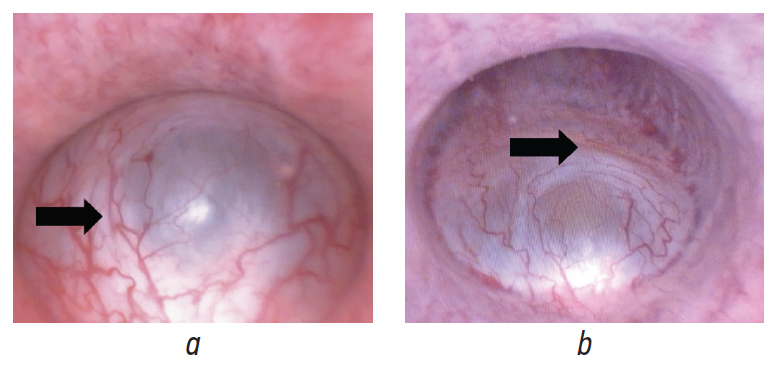 Fig. 7. Urethroscopic picture of patient Sh., 19 years old: a – the anterior wall of the bulbourethral cyst; b – the septum in the cyst (indicated by arrows) / Рис. 7. Уретроскопическая картина пациента Ш., 19 лет: а — передняя стенка бульбоуретральной кисты; b — перегородка в кисте (указаны стрелками)