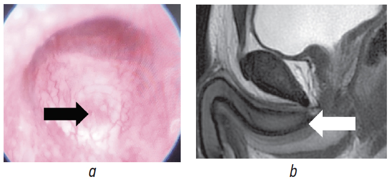 Fig. 8. Patient Sh., 19 years old: a – urethroscopic picture of (the arrow indicates the “window” of the emptied cyst); b – control magnetic resonance imaging of the small pelvis without signs of cystic enlargement (the arrow indicates the place of the previously located cyst) / Рис. 8. Пациент Ш., 19 лет: a — уретроскопическая картина (стрелкой указано «окно» опорожнившейся кисты); b — контрольная магнитно-резонансная томограмма малого таза без признаков кистозного расширения (стрелкой указано место ранее расположенной кисты)