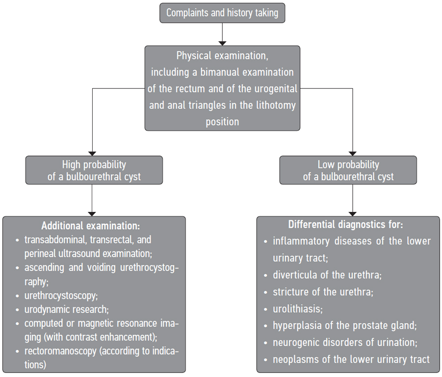 Diagnosis of a bulbourethral cyst is based on a thorough history taking and assessment of patient complaints, taking into account his age, supported by data from radiation and endoscopic examination methods. Melquist et al. [6] proposed a simple algorithm for diagnosing syringocele. However, we recommend supplementing this approach with differential diagnostics with diseases such as urolithiasis, inflammatory diseases of the lower urinary tract and male genital organs, and urethral stricture, as well as with neoplasms of the pelvic organs (Fig. 4).