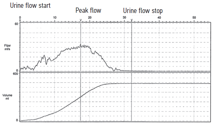 Patient Sh. (19 years old) was admitted to the urology clinic of the S.M. Kirov Military Medical Academy in August 2020 with complaints of intermittent, dull, and nagging pain along the urethra during urination and discomfort in the perineum. History assessment revealed that the above sensations occurred about 2 weeks ago after he experienced hypothermia. Digital rectal examination revealed the moderately enlarged prostate gland, without areas of fluctuation. Bimanual examination showed moderate tenderness in the perineum. Indicators of general clinical and biochemical blood tests were within the reference values. In the general analysis of urine, leukocyturia was determined, with up to 15–20 in the field of view. Bacteriological examination of urine showed the growth of Corynebacterium gluсuronolyticum at 5 × 103 CFU/ml. Ultrasound examination of the kidneys and urinary bladder did not detect pathological changes; the volume of the prostate gland was 23.1 cm3, and there was no residual urine. With uroflowmetry, the maximum urination rate was 33.7 ml/s, the average urination rate was 15.1 ml/s, the urination time was 32.3 s, and the volume of excreted urine was 468.7 ml (Fig. 5).