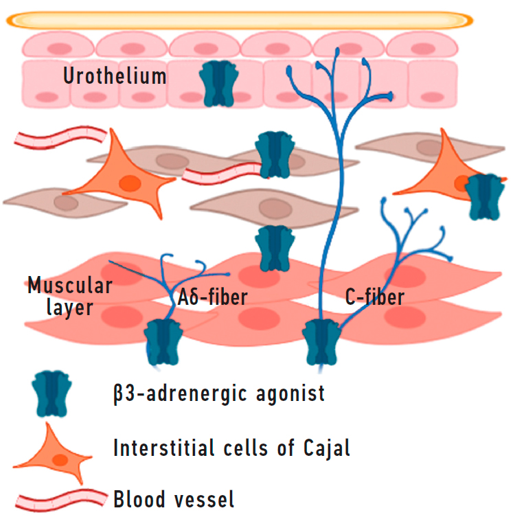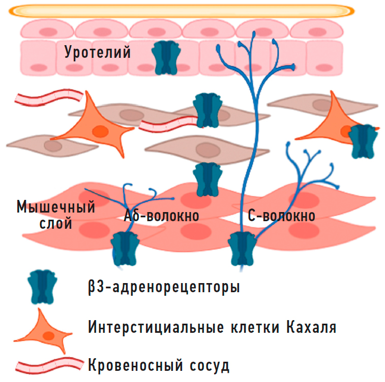 В стенке мочевого пузыря β3-адренорецепторы были идентифицированы помимо миоцитов также в уротелии, интерстициальных клетках Кахаля, Aδ- и С-нервных волокнах и кровеносных сосудах (рис. 1) [40]. Полагают, что активация расположенных вне миоцитов β3-адренорецепторов способствует уменьшению афферентной активности мочевого пузыря [38, 41].