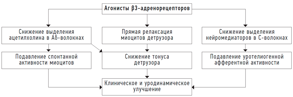Рис. 2. Механизм лечебного эффекта агонистов β3-адренорецепторов у пациентов с детрузорной гиперактивностью и гиперактивным мочевым пузырем.