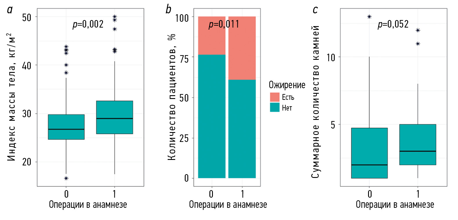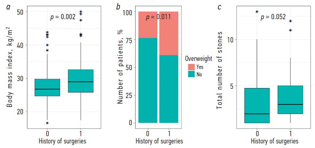 Fig. 3. Comparative characteristics of patients with recurrent urolithiasis depending on previous surgeries: body mass index (a), obesity (b), total number of stones (c).