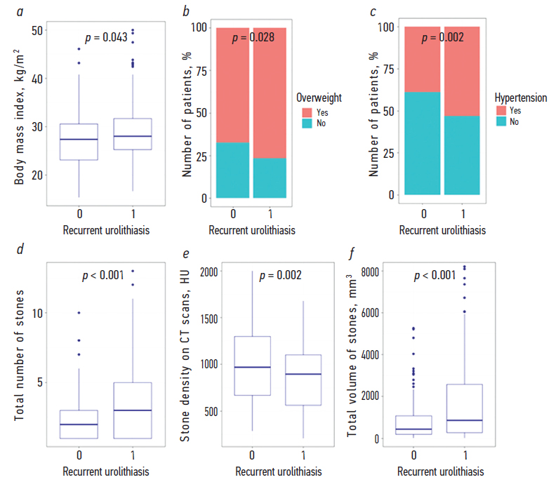 Fig. 1. Comparative characteristics of patients with recurrent and primary urolithiasis: body mass index (a), excess body weight (b), hypertension (c), total number of stones (d), stone density according to computed tomography (e), total stone volume (f).