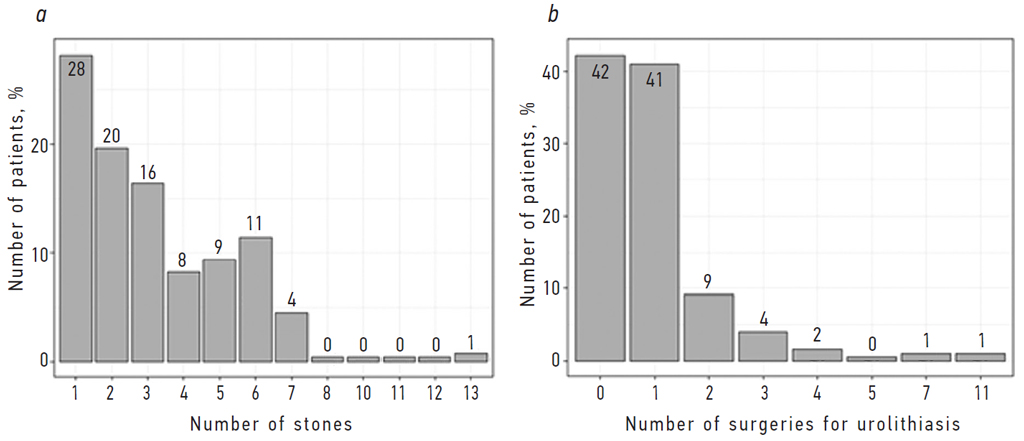Fig. 2. Distribution of patients with recurrent urolithiasis depending on the number of stones (a) and previous surgeries for urolithiasis (b).