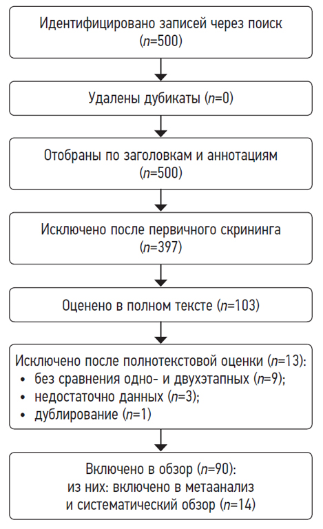 Проведен всесторонний поиск публикаций в базах данных PubMed/MEDLINE, Scopus, Web of Science и РИНЦ (российская литература) по январь 2025 г. включительно. Использовали следующие ключевые слова и их сочетания (на английском и русском языках): bulbar urethral stricture, urethroplasty, buccal mucosal graft, one-stage, two-stage, Johanson, obliteration (бульбарная стриктура, уретропластика, буккальный трансплантат, одноэтапная, двухэтапная, облитерация уретры). Также вручную просмотрены списки литературы выявленных статей и материалы профильных конференций (поиск по принципу «snowballing»). На этапе первичного отбора (по заголовкам и резюме) выявлено более 500 источников. После исключения нерелевантных работ и дублей (397 публикаций) к полнотекстовой оценке было привлечено 103 статьи. Из них 13 работ исключены при полнотекстовом анализе (отсутствие сравнительного анализа интересующих методов — n = 9; недостающие данные по исходам — n = 3; дублирование данных в более поздней публикации — n = 1). В итоге в качественный анализ включено 90 публикаций. Для систематического обзора отобрано 14 исследований, соответствующих критериям отбора, из которых 5 предоставили сопоставимые числовые данные и были включены в метаанализ (рис. 1).