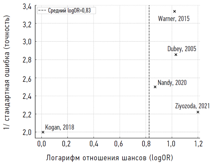 Качество и риск смещения: по шкале NOS средний балл составил 6 (от 5 до 7), что свидетельствует об удовлетворительном качестве. Ограничивающими факторами были отсутствие рандомизации и слепая оценка исходов, а также потенциальные систематические различия между группами: в двух исследованиях отмечено, что пациентов с более тяжелыми поражениями (большая протяженность стриктуры, выраженный лихен-склероз) чаще направляли на двухэтапное лечение [3, 6]. Это могло приводить к смещению результатов в пользу одноэтапной уретропластики (более легкие случаи). Тем не менее в многоцентровом исследовании J.N. Warner и соавт. [1] группы были сопоставимы по тяжести стриктуры, и различия исходов сохранялись после поправки на этиологию и длину. Анализ через воронкообразный график по основному исходу (успешности) не выявил значительной асимметрии (рис. 2), однако из-за малого количества исследований статистическая проверка (тест Эггера) оказалась незначима. Следует отметить, что логарифм ОШ в исследовании М.И. Когана и соавт. [3] близок к 0 в связи с примерно равными шансами на выздоровление. Распределение точек на рис. 2 относительно вертикальной пунктирной линии (суммарный эффект) симметрично, что указывает на умеренную вероятность публикационного смещения.