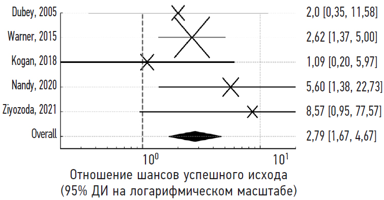 4. Рис. 3. Лесной график (forest plot) сравнительной успешности одно- и многоэтапной уретропластики. Отдельные исследования представлены с указанием авторов и года; горизонтальные отрезки — 95% доверительные интервалы, крест — точечная оценка отношения шансов (ОШ) (размер креста по значимости исследования). Обобщенный эффект (Overall) показан черным ромбом. Вертикальная пунктирная линия соответствует отсутствию различий (ОШ 1). Значение ОШ > 1 свидетельствует о преимуществе одноэтапной уретропластики.