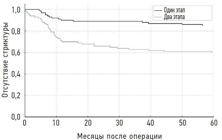 Хотя средний период наблюдения в большинстве работ составил 2–3 года, в двух исследованиях (D. Dubey и соавт. [5] и S. Kulkarni и соавт. [7]) представлены более длительные результаты. М.И. Коган и соавт. [3] наблюдали пациентов до 5 лет и не выявили поздних рецидивов после 2 лет наблюдения. Мы построили сводную кривую по методу Каплана–Майера на основании объединенных данных: она демонстрирует, что основное расхождение между методами приходится на первый год после вмешательства (большинство рецидивов в группе двухэтапной пластики возникают до этапа тубуляризации, то есть это даже не всегда рецидив, а часто — неэффективность первого этапа), далее кривые идут параллельно (рис. 4). К 5 годам доля пациентов без рецидива по объединенным данным оценивается в 85% для одноэтапной и 60–65% для многоэтапной уретропластики.