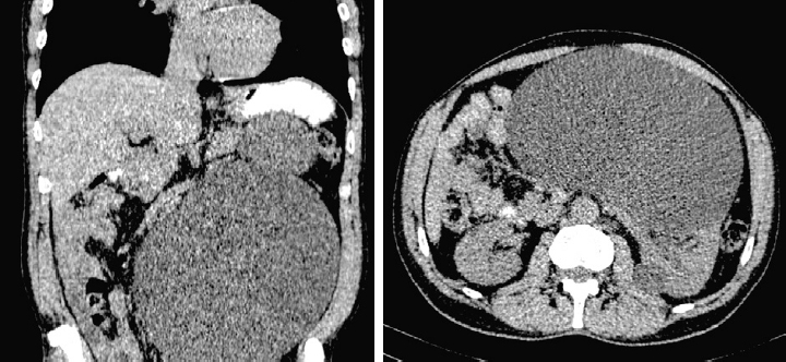 Пациент, 55 лет, был госпитализирован в хирургическое отделение СПбГБУЗ «Городская больница № 15» с жалобами на периодическую боль в животе, увеличение живота в размерах, невозможность похудеть при соблюдении диеты. Из анамнеза известно, что около года назад перенес двустороннюю пневмонию, в связи с чем за неделю до госпитализации выполнил контрольное КТ органов грудной клетки, где на краевых срезах диагностирована киста брюшной полости. Консультирован хирургом поликлиники, выдано направление для госпитализации. Пациенту в стационаре выполнена КТ органов брюшной полости с внутривенным контрастированием: в забрюшинном пространстве слева выявлены два образования жидкостной плотности, неправильно-округлой и округлой формы, четко очерченные, размерами до 224 × 140 × 240 и 84 × 79 × 78 мм соответственно (третий размер по сагиттальным срезам), без признаков накопления контрастного вещества на постконтрастных изображениях. Почки расположены в типичном месте, паренхима не истончена, однородной консистенции. Чашечно-лоханочная система левой почки расширена. Мочеточники с обеих сторон не расширены. Выделительная функция обеих почек своевременная, симметричная. Рентгеноконтрастных конкрементов в проекции мочевыводящих путей не выявлено. По результатам КТ сложилось впечатление, что оба кистозных образования исходят из левой почки. Установлен диагноз: «Кисты левой почки, тип II по классификации Bosniak» (рис. 1).